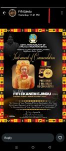 The President of Angola-Nigeria Business Council, Princess Fifi Ekanem Ejindu has bagged a symbolic recognition from the government of the Republic of Angola on the occasion of the country’s 50th Independence Anniversary Celebration.