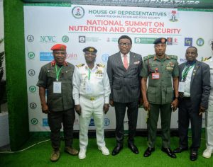Photo caption: L-R: ACG Ogah Benson of the Nigerian Security and Civil Defence Corps (NSCDC), representing the CG of NSCDC, Rear Admiral Yusuf Sani Idris, representing the Chief of Naval Staff, Chairman House Committee on Nutrition and Food Security, Hon. Chike Okafor, Maj. Gen. O. M. Dare, representative of the Chief of Army Staff and Director at DSS Headquarters, Iliyasu Sani, representing DG, DSS, at the 3rd Day of National Summit on Nutrition and Food Security.