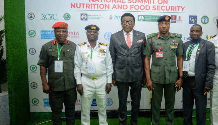 Photo caption: L-R: ACG Ogah Benson of the Nigerian Security and Civil Defence Corps (NSCDC), representing the CG of NSCDC, Rear Admiral Yusuf Sani Idris, representing the Chief of Naval Staff, Chairman House Committee on Nutrition and Food Security, Hon. Chike Okafor, Maj. Gen. O. M. Dare, representative of the Chief of Army Staff and Director at DSS Headquarters, Iliyasu Sani, representing DG, DSS, at the 3rd Day of National Summit on Nutrition and Food Security.