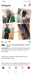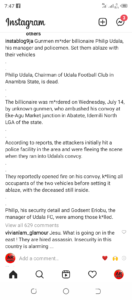 News GUNMEN MURDER BILLIONAIRE FOOTBALL CLUB OWNER, BURN HIM AND HIS AIDES, BURN THEIR CORPSES IN ANAMBRA, SEE PICS By Abuja Reporters Last updated Jul 15, 2021 2 2 Share FacebookTwitterWhatsAppEmailLinkedin