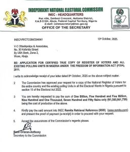 The Commission received the request on 8th October 2025 and responded on 13th October 2025, approving the application while outlining the cost for processing and issuance. The sum quoted – 1,505,901,750 Naira – has become a subject of media attention and public inquiry.