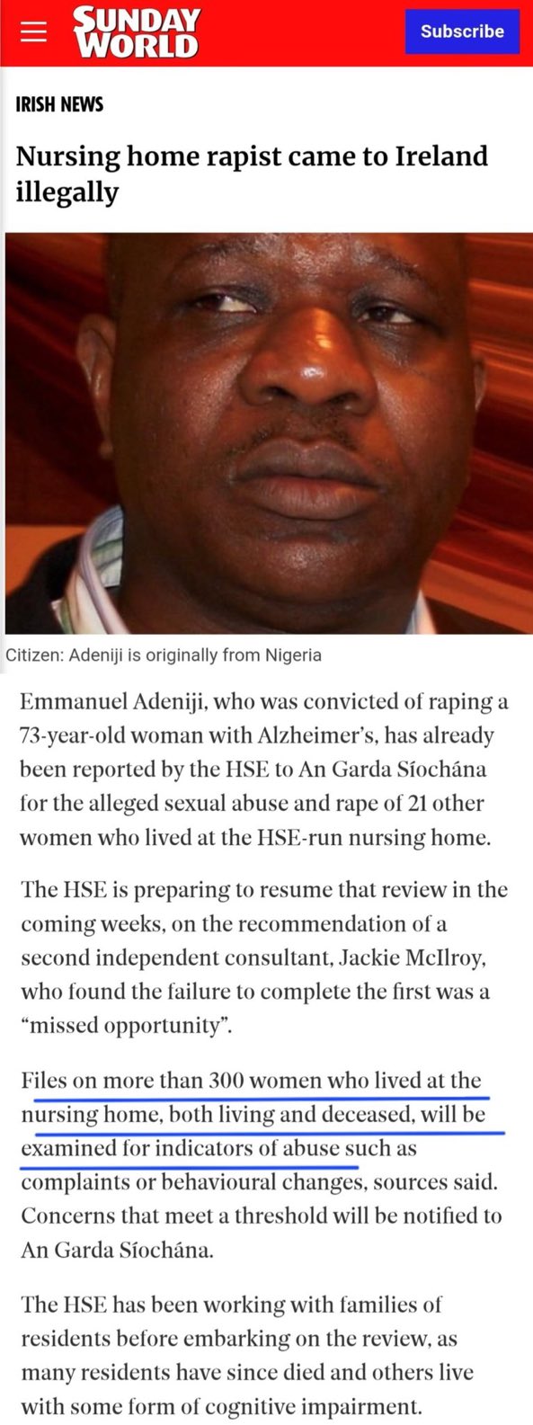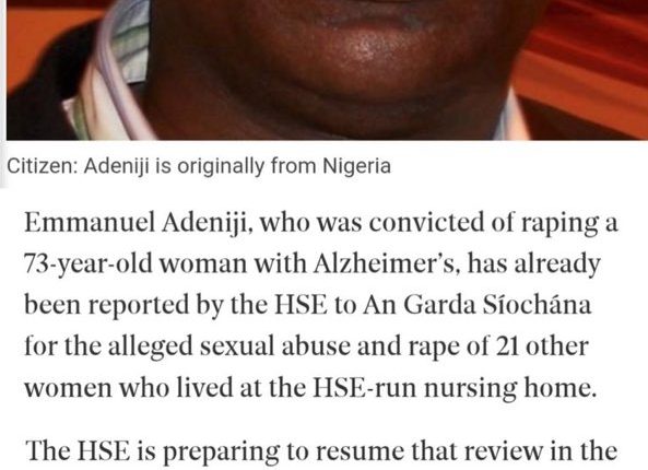 NIGERIAN MAN ENTERS IRELAND ILLEGALLY, RAPES 73-YR OPD WOMAN WHO HAS DEMENTIA, NOW UNDER PROBE HE MIGHT HAVE RAPED OVER 300 OTHER VICTIMS