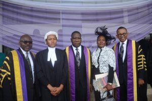 From left to right: Dr Muniz Banire, SAN, the new wig Kanyinsola Ajulo, Senate Majority Leader Senator Opeyemi Bamidele, proud parents Lady Kofoworola & Dr Kayode Ajulo, OON, SAN at the Body of Benchers Complex in Abuja during the Call to Bar Ceremony.