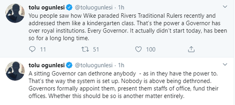 He said governors have veto powers over monarchs in their states citing Governor Nyesom Wike of Rivers State, who “paraded Rivers traditional rulers recently and addressed them like a kindergarten class”, adding; “that is the power a governor has over royal institutions. Every governor. It actually didn’t start today, it has been so for a long long time”.