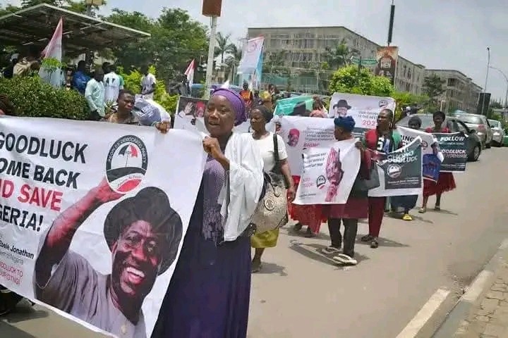 PRO-JONATHAN PROTESTERS DEMANDING FORMER PRESIDENT’S RETURN TO POWER STORM PDP SECRETARIAT