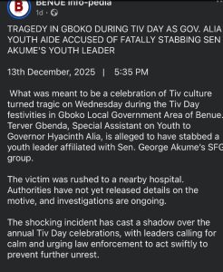 WATCH VIDEO AS BENUE GOVERNOR ALIA AND APC CHAIRMAN RUN FOR DEAR LIVES AS SUPPORTERS OF THE GOVERNOR AND SGF CLASH DURING TIV DAY CELEBRATION, LEAVING ONE DEAD